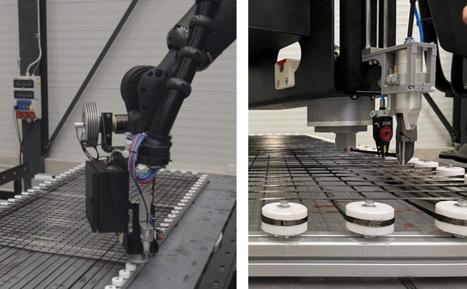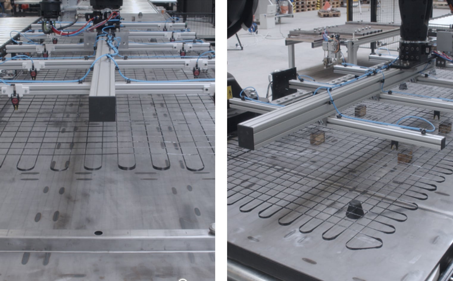 Im Rahmen mehrerer Projekte haben wir bei die Entwicklung eines Verfahrens zur vollautomatisierten Herstellung nichtmetallischer Bewehrungsstrukturen für Carbonbeton-Fertigteile – umgesetzt durch unseren Partner Forschungs- und Transferzentrum Leipzig e. V. - unterstützt. Die Garnablage erfolgt durch 6-Achs-Roboter, die komplexe 3D-Geometrien präzise und reproduzierbar fertigen können – direkt auf der Umlaufanlage und in Losgröße 1. Das System lässt sich einfach in bestehende Fertigungsprozesse integrieren, reduziert Verschnitt auf ein Minimum und stärkt den ökologischen Charakter der Bauteile durch gezielten Materialeinsatz.