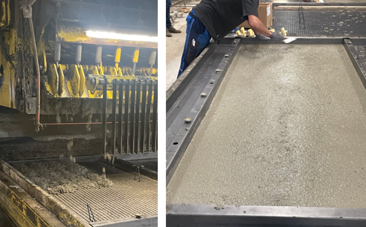 Nach dem Einlegen der Bewehrung wird die Carbonbeton-Matrix direkt in die Schalung eingebracht und dort gleichmäßig verteilt. Für eine hohe Bauteilqualität erfolgt im Anschluss eine gezielte Verdichtung, um Lufteinschlüsse zu minimieren und die Formgenauigkeit und Dauerhaftigkeit der Schale sicherzustellen. Die Abläufe wurden an die spezifischen Anforderungen des Werkstoffs und der filigranen Geometrien angepasst sowie für den Serienbetrieb vorbereitet.