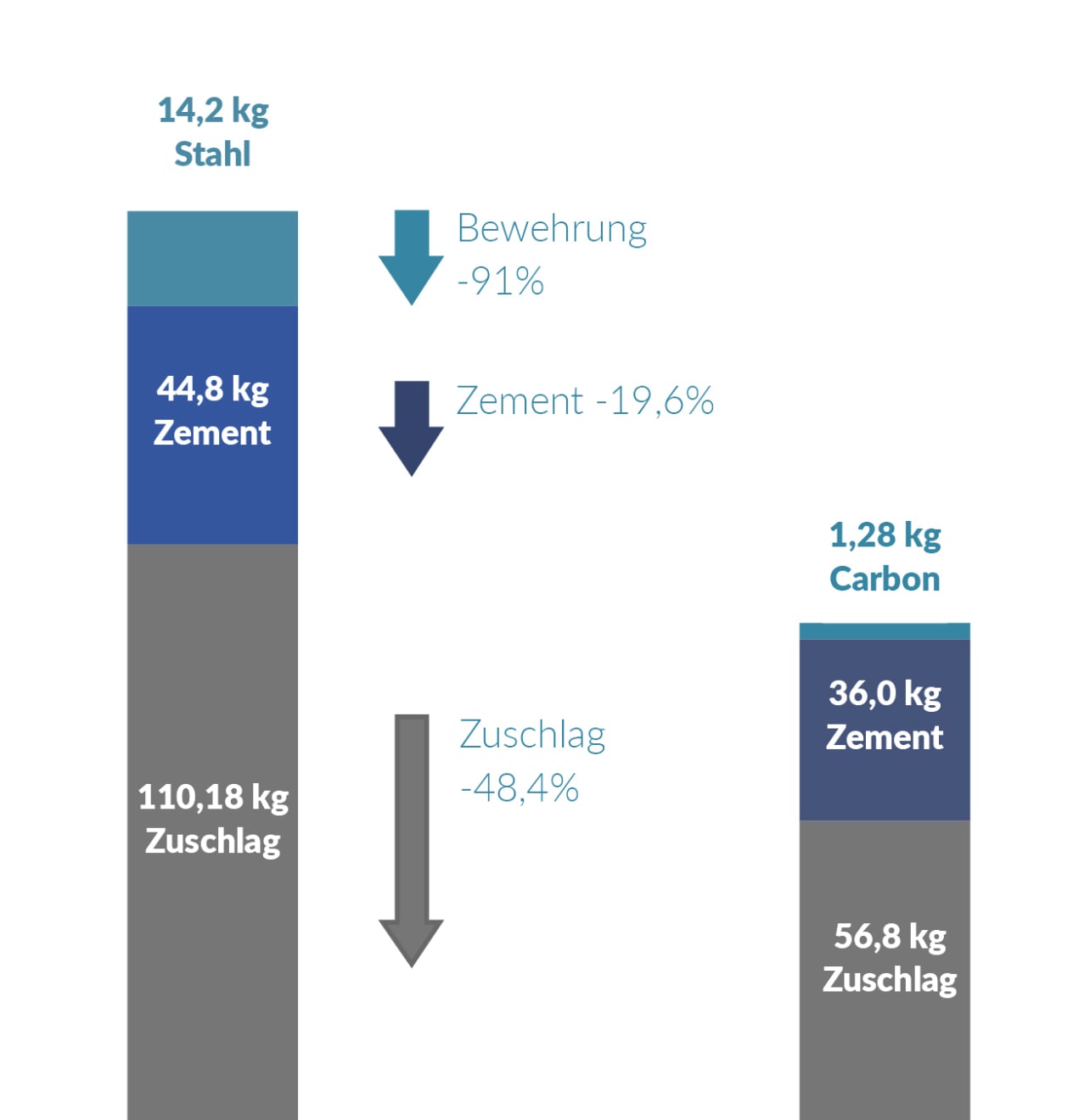 In der Carbonbetonbauweise wird anstelle einer Stahlbewehrung eine Carbonfaserbewehrung in Form von Stäben oder Gelegen als Verstärkung in den Beton eingesetzt. Diese besitzt im Vergleich zu Stahl ein sehr geringes Gewicht bei einer gleichzeitig deutlich höheren Zugfestigkeit. Aufgrund der ausbleibenden Korrosionsgefahr der Bewehrung entfällt zudem ein wesentlicher Faktor für Wartungsarbeiten und für die Begrenzung der Lebensdauer eines Bauwerks. Momentan geht man von einer Lebensdauer von 200 Jahren für Carbonbetonbauteile aus, wobei im Anschluss ein nahezu vollständiges Recycling des Betons und der Bewehrung (>99%) durch eine sortenreine Trennung möglich ist.
